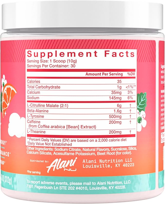 - INCREASE PERFORMANCE: Take 20-30 minutes before your workout for sustained energy and endurance to help achieve your fitness goals. Alani Nu Preworkout contains essential amino acids like L-Theanine to prevent you from crashing, Citrulline to improve the amount of oxygen in your muscle tissue, provides enzymes crucial to cardiovascular health, and beta alanine to regulate lactic acid accumulation in muscles.