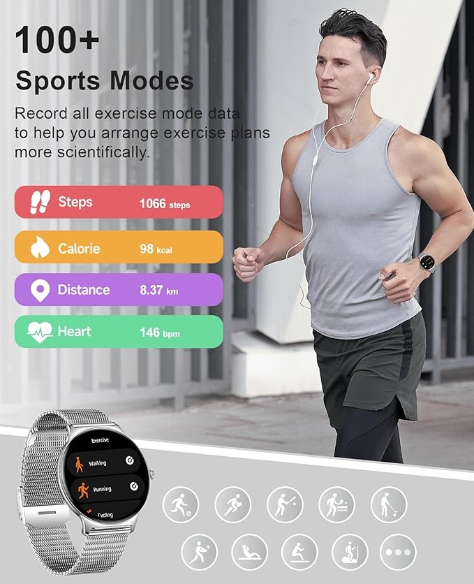 - 【100+ Sports Modes & IP67 Waterproof】Elevate your fitness with this versatile smartwatch featuring 100+ sports modes, including walking, running, dancing, gym workouts, outdoor adventures, and more. Track key metrics like steps, calories, and heart rate for a complete overview of your performance. Built with IP67 waterproof protection, it withstands rain and sweat, letting you exercise worry-free in any environment. Note: Not suitable for swimming, diving, or prolonged sauna use.