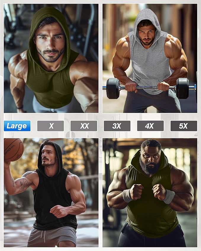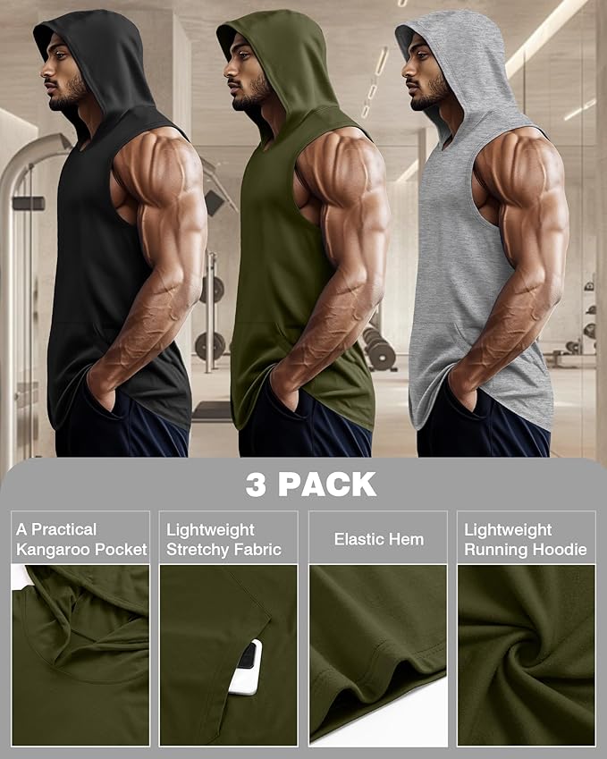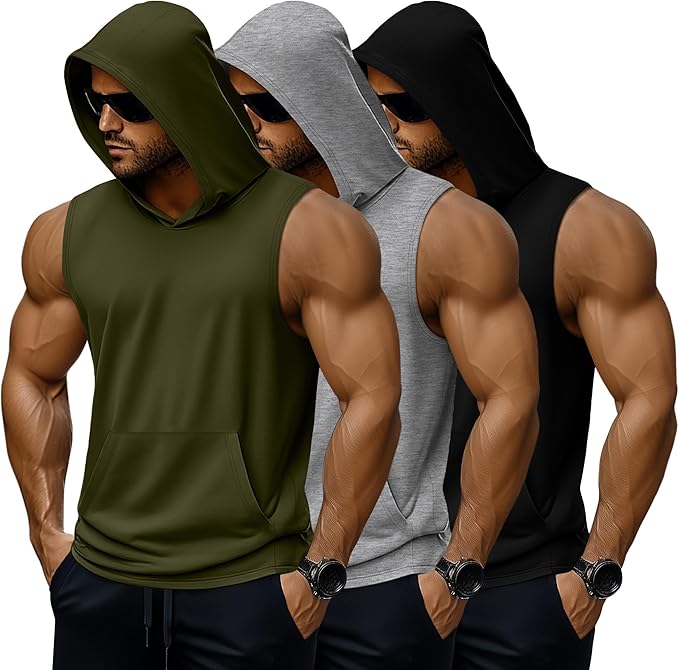 3 Pack Men's Big & Tall Workout Hooded Tank Tops, Cotton Sleeveless Gym Hoodies Bodybuilding Muscle Cut Off Shirts