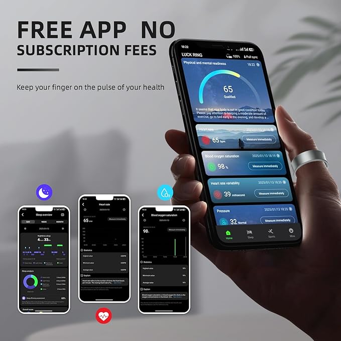 - 🚵♀️【Track your health with your fingers】: This slim important health ring for men and women provides 24-hour blood oxygen, 24-hour heart rate and 24-hour blood pressure monitoring. You can conveniently view these real-time health indicators from the app anytime, anywhere, and you can view daily, weekly and monthly health data in the app. Provides the function of recording female menstrual period, Multi-dimensional analysis of exercise data, heart rate data, and sleep data to calculate body fatigue status, helping you explore a healthier lifestyle