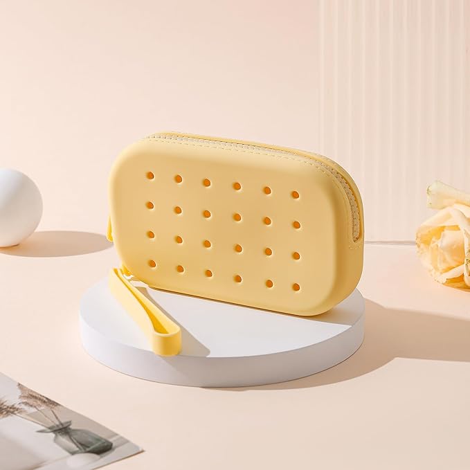 Portable Silicone Makeup Bag for Women, Small Travel Toiletry Cosmetic Bag with Decorative Holes, Zipper Closure Organizer Makeup Case with Handle (Yellow)