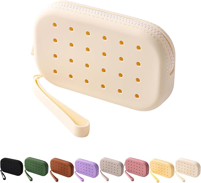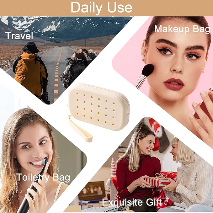 Portable Silicone Makeup Bag for Women, Small Travel Toiletry Cosmetic Bag with Decorative Holes, Zipper Closure Organizer Makeup Case with Handle (Milky White)