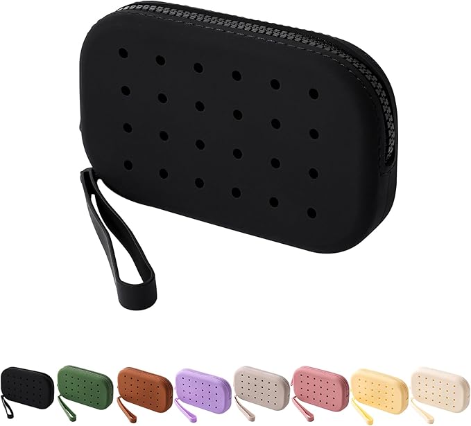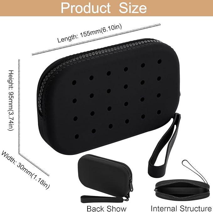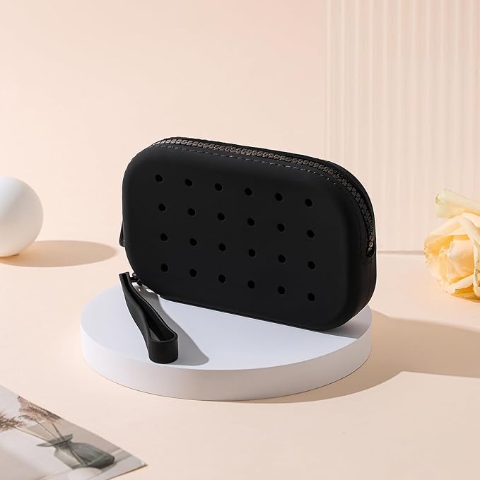 Portable Silicone Makeup Bag for Women, Small Travel Toiletry Cosmetic Bag with Decorative Holes, Zipper Closure Organizer Makeup Case with Handle (Black)