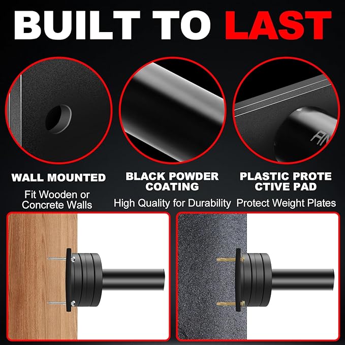 • Weight Plate Storage Rack for Home Gym - Wall-Mounted Bumper Plate Holder with Heavy Duty Steel · High Capacity Storage: Designed to hold multiple weight plates securely, perfect for organizing your home gym. · Tilted Plate Holder: Slight 2° tilt prevents plates from sliding off, keeping them safely stored. · Durable & Scratch-Resistant: High-quality steel with a protective hard-coat finish. · Universal Fit: Fits all 2" Olympic weight plates, with included installation hardware for both wood and concrete walls. · Impact Protection: Foam padding reduces wear and tear on plates and the rack.