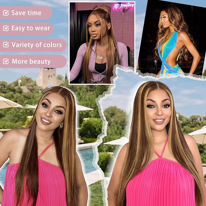 26 Inch Highlight Ombre Lace Front Wig Human Hair 200% Density Highlight Wig Human Hair 7x5 Ombre Straight Honey Blonde Wig Brown Highlighted Wig Pre Plucked With Baby Hair