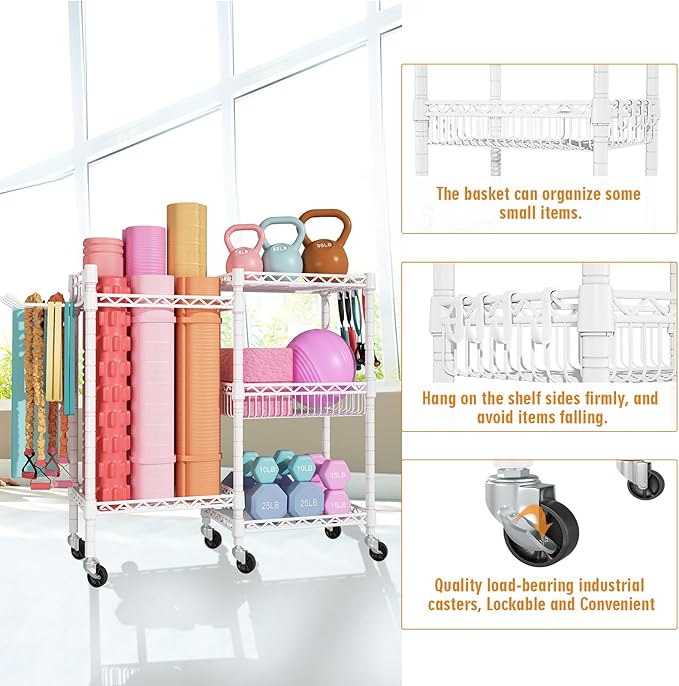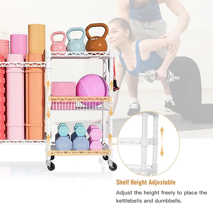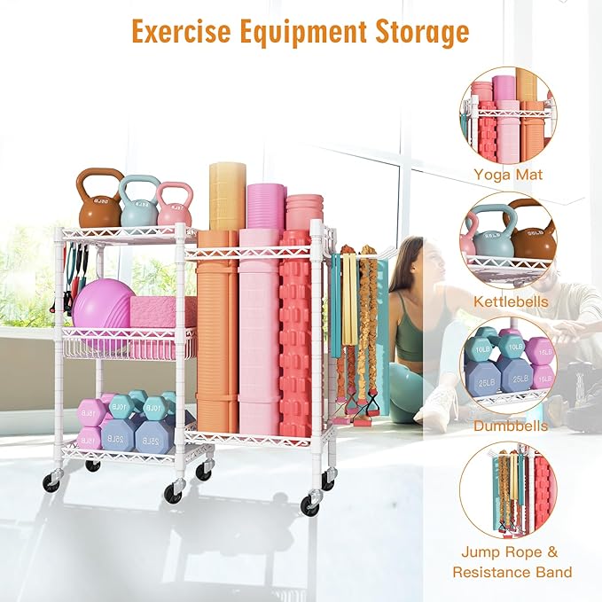 Home Gym Storage, 3 Tiers Workout Equipment Organizer with Wheels for Yoga Mats, Foam Roller, Dumbbells, Kettlebells, and Resistance Bands