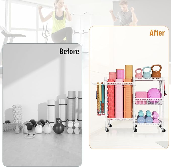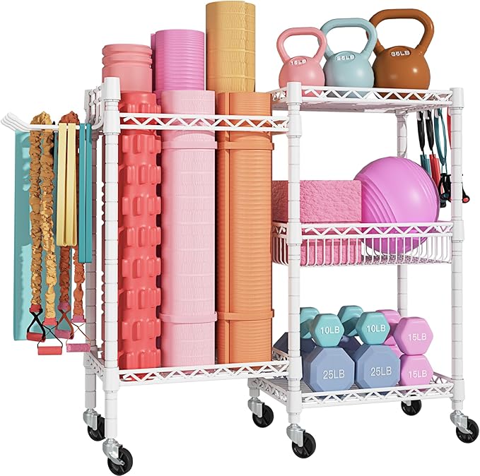 - Multiple Usage: The compact and portable home gym storage rack can be used to organize yoga mats, foam rollers, yoga bolsters, yoga balls and blocks, dumbbells, kettlebells, resistance bands, yoga straps, jump ropes, yoga wheels, hula hoops and more. Meanwhile, the storage rack can be placed on your door entry, it can use to place shoes, umbrellas, and other items