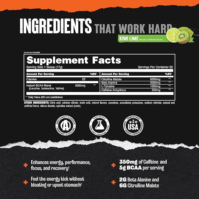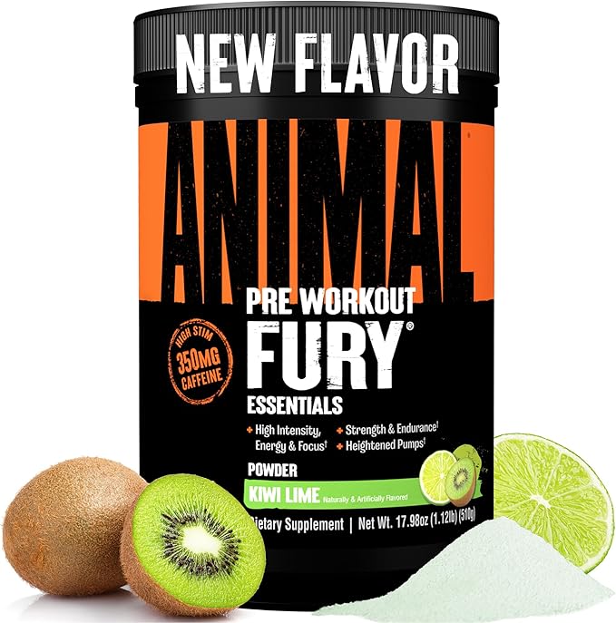 Animal Fury Pre Workout Powder - Endless Energy and Focus Supplement with 5g BCAA, 350mg Caffeine Nitric Oxide Booster with Beta-Alanine Preworkout for Men and Women, NEW Kiwi Lime Flavor, 30 Servings