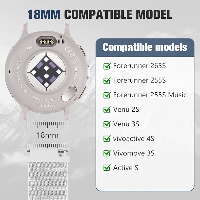 - 18MM COMPATIBLE MODELS: Fit for all traditional watch and smart watch with 18mm width watch lugs. Compatible for Garmin Venu 3S/Venu 2S/Vivoactive 4S/Vivomove 3S/Active S, Forerunner 255S/Forerunner 255S Music/Forerunner 265S