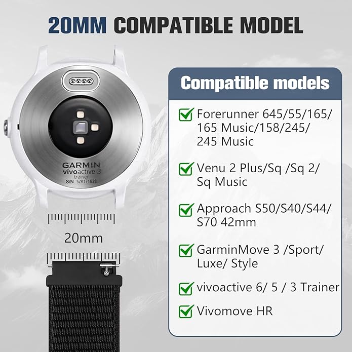 • 20MM COMPATIBLE MODELS: Fit for all traditional watch and smart watch with 20mm width watch lugs. 20mm compatible for Garmin Forerunner 645/ 55/165 /165 Music/ 158/ 245/ 245M Music, Venu 2 Plus/Venu Sq/Sq2/Sq Music, Approach S50/S40/S44/S70 42mm, GarminMove 3/Sport/Luxe/Style, Vivoactive 6/ Vivoactive 5/ 3 trainer/ Vivomove HR