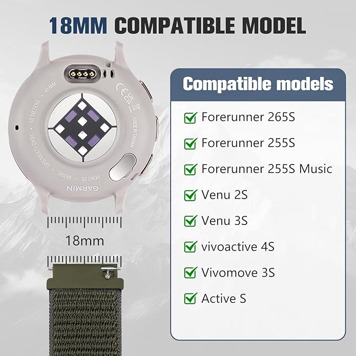 - 18MM COMPATIBLE MODELS: Fit for all traditional watch and smart watch with 18mm width watch lugs. Compatible for Garmin Venu 3S/Venu 2S/Vivoactive 4S/Vivomove 3S/Active S, Forerunner 255S/Forerunner 255S Music/Forerunner 265S