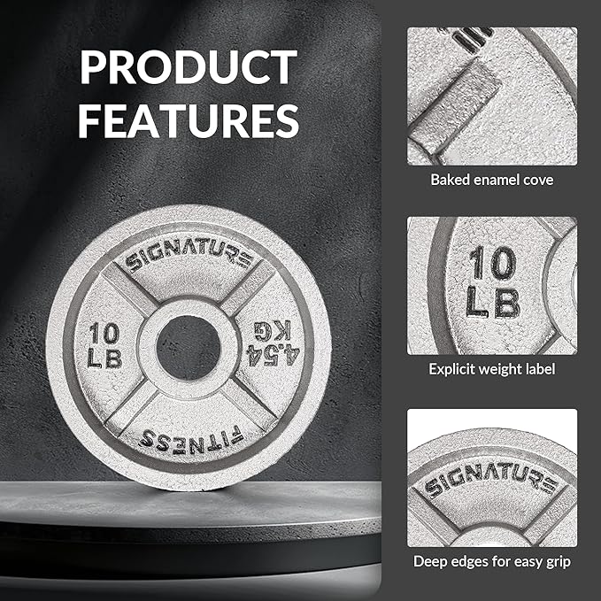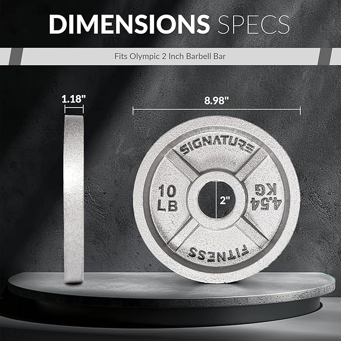 - OLYMPIC STYLE PLATES – Constructed of Solid Cast Iron with a 2-inch machine drilled hole and durable Silver Enamel finish. Simple, classic, and tough enough to endure a rock-solid workout! Note: Each weight plate has a 2-inch center hole diameter that is designed to fit on standard Olympic Barbells.