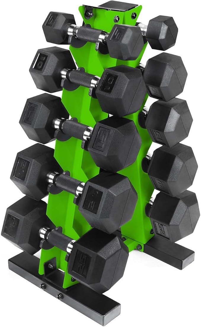 - SET INCLUDES – A pair of 5-pound, 10-pound, 15-pound, 20-pound, and 25-pound coated hex dumbbells with upgraded grip and an A-frame dumbbell rack to store the weights. This set ships in multiple boxes