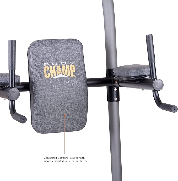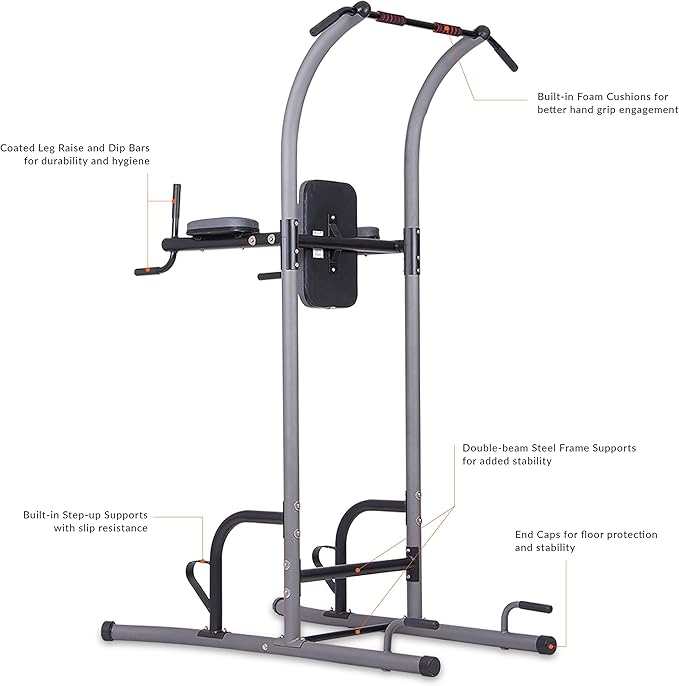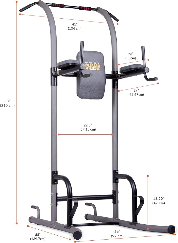 - Sturdy Design With Reliable Support: We Designed This Standing Power Tower With An H-Frame Base For Enhanced Stability So The User Can Perform Exercises On Either Side. It Also Has 2 Arched Stability Bars To Make The Steel Frame Sturdy. It Measures 58.5" X 46.5" X 83"