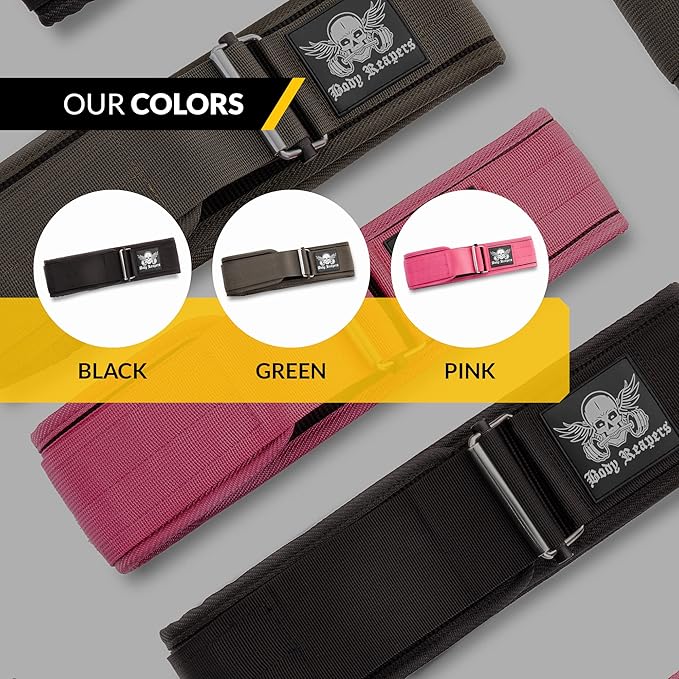 - DURABLE NYLON WEIGHTLIFTING BELT: BodyReapers presents a 4-inch wide workout belt for men & women, made of 100% high-quality nylon with reinforced stitching. This quick locking belt weightlifting accessory is designed to withstand heavy weights, including Olympic standard lifts.