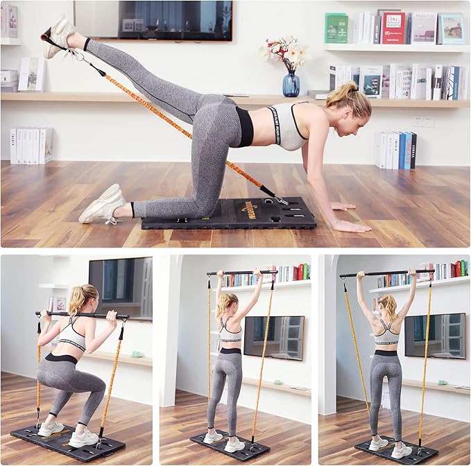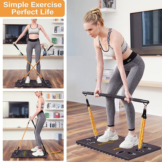 - BRING THE GYM TO YOU - This gym system includes a piece of main base, 2*30lbs exercise bands, 2*50lbs exercise bands, a collapsible bar, 2*handles, 2* ankle straps, a door anchor, and a carry bag. You can simulate all the bulky equipment and machines you see at the gym to work all your muscle groups. FOLLOW US NOW!