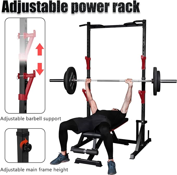 - ADJSTABLE BARBELL SUPPORT ARMS & HEIGHT:Single-side 17-hole barbell support arm with random height plus the main frame 6-speed height adjustment weight rack, whether doing squats or bench press can be well adapted to different heights and different parts of the exercise needs. Standard 1in adjustment hole to accommodate most market accessories