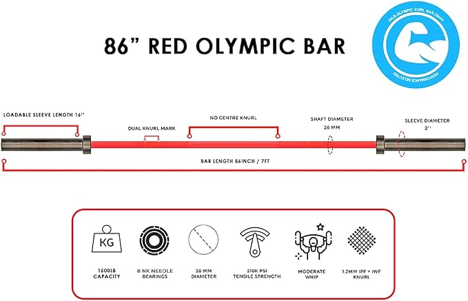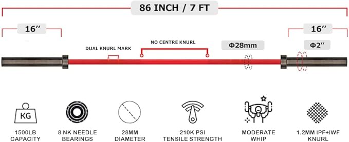 - 【WHAT’S IN THE PACKAGE】This bar is a Red 20 KG Bar. It is 86 inches long, has 16.4 inch loadable sleeve lengths, and 28 MM in diameter. 16 bearings total (8 per sleeve).