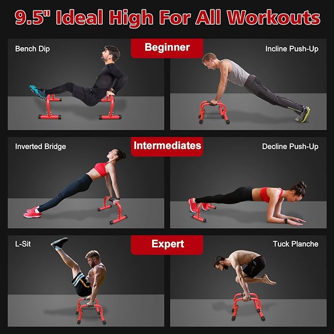 - 【Ergonomic Foam Grip 】Parallettes bars provide a ergonomic full-coverage foam handle gives you enough grip space. 1.5'' thickened foam is comfortable to grip and reduces hand fatigue. High-density foam effectively prevent sliding and offers excellent grip even with sweaty hands.