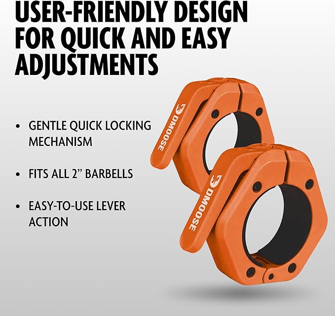 - ππππ-π πππππππ ππππππ π ππ πππππ πππππππππππ: DMoose Quick Release Clamp features a user-friendly design that fits all 2" barbells. Quickly adjust and secure your weights with ease, saving time and keeping your workout momentum strong. Ideal for both home and commercial gyms. Enjoy seamless transitions between sets with these easy-to-use weight clamps, designed for quick and efficient adjustments.