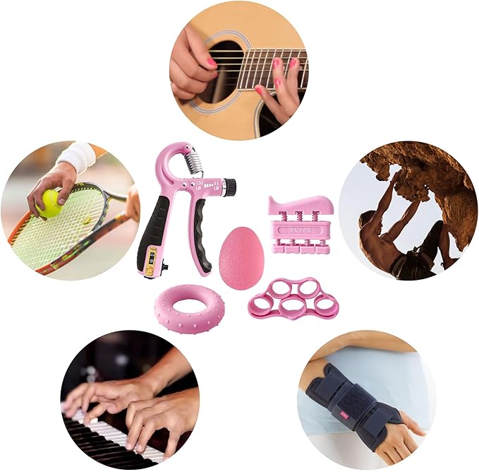 - Grip Strengthener Kit: Includes adjustable hand gripper (11-132Lbs), finger exerciser (4Lbs per finger), grip ring (50Lbs), stress relief ball, and stretchers (6.6Lbs, 8.8Lbs, 11Lbs); targets different muscle groups