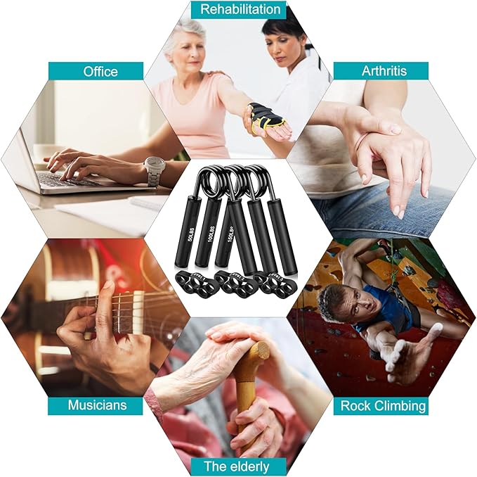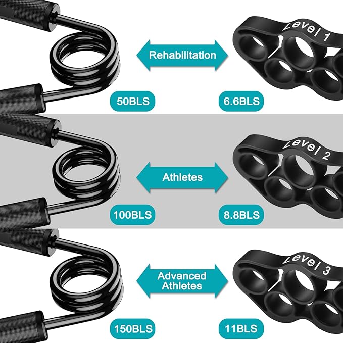 - HAND STRENGTHENER & FINGER EXERCISER KIT 6 PACK: This set includes 3 forearm strengthener (50 lbs, 100 lbs, 150 lbs) and 3 finger exerciser (6.6 lbs, 8.8 lbs, 11 lbs), enabling you to comprehensively and effectively enhance your hand muscles through alternating gripping and stretching exercises.
