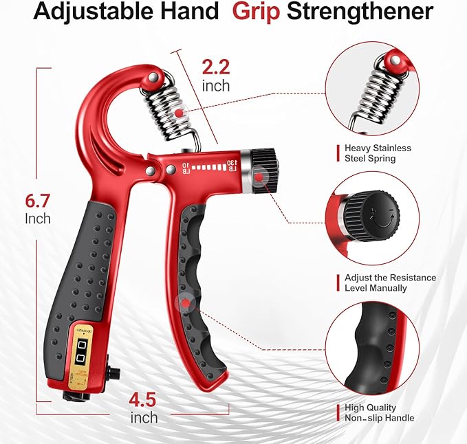 - 【Comfortable & Portable】The grip strength trainer features an ergonomic and soft handle that fits comfortably in small and large hands, catering to seniors, teenagers, and individuals of all ages. The resistance levels of the hand grips can be easily adjusted from 10 to 130lbs, making it suitable for both men and women with varying strengths. With its portability, you can conveniently use the hand grip strengthener anytime, anywhere.