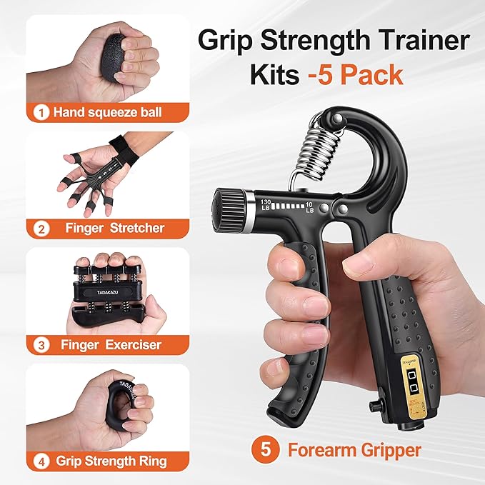 - 【Complete Hand Grip Strengthener Workout Kits 5 Pack】The grip trainer set includes an Adjustable Hand Gripper, Wrist Workout, Finger Stretcher Resistance Band, Hand Strengthener Grip Ring, and Stress Relief Grip Ball. These tools effectively strengthen and exercise your hands, fingers, wrists, elbows, and forearms.