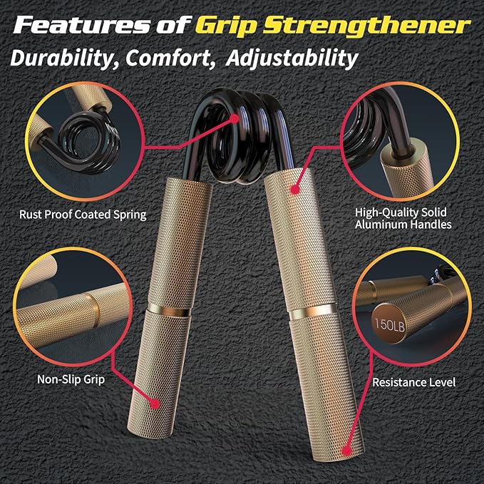 - 【Durable & Premium Materials】This hand grip trainer is made of aluminum handles and rust-proof coated springs for a long-lasting hand gripper tool. The knurled design increases the friction of the hand grip gripper, protecting your hands and fingers from abrasions, which will bring you a pleasant exercise experience.
