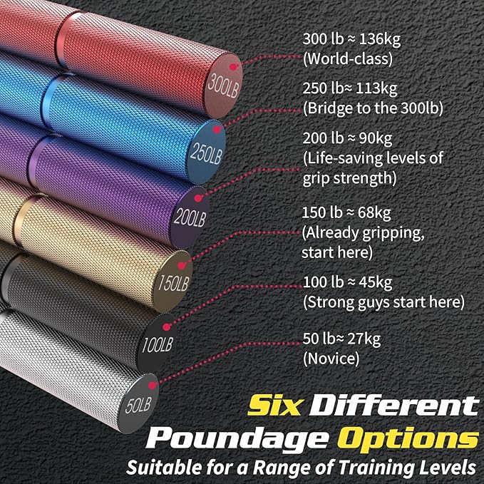- 【6 Packs Grip Strength Trainers】6 different pounds of grip.Respectively 50LB, 100LB, 150LB, 200LB, 250LB, and 300LB to meet the needs of different training purposes. Gradually increase grip strength through a progressive and goal-oriented training regimen. Suitable for all people, whether you are an office professional or athlete, sports, fitness trainer, fitness, musicians and so on.