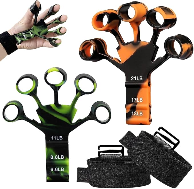 - 【6 Resistant Levels】Build Your Grip Gradually,This adjustable hand grip set by offers 6 resistance levels, Finger grip strengthener with 2 colors (gray grip claw-6.6LB, 8.8LB, 11LB, black grip claw-13LB, 17LB, 21LB) and two wrist bands.Compared with other finger trainers, this finger trainer can comprehensively exercise the arm, wrist, finger and other hand positions.