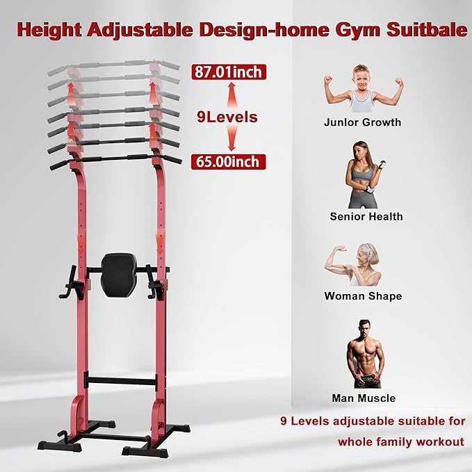 - 💪[9-POSITION HEIGHT ADJUSTMENT] The upper pull-up bar height can be adjusted from 60 inches to 87 inches, adjusting the correct size according to your height and place of use (home, office, gym). The backrest has two levels of adjustment, easily adjusting to your workout comfort and protecting your spine while exercising.