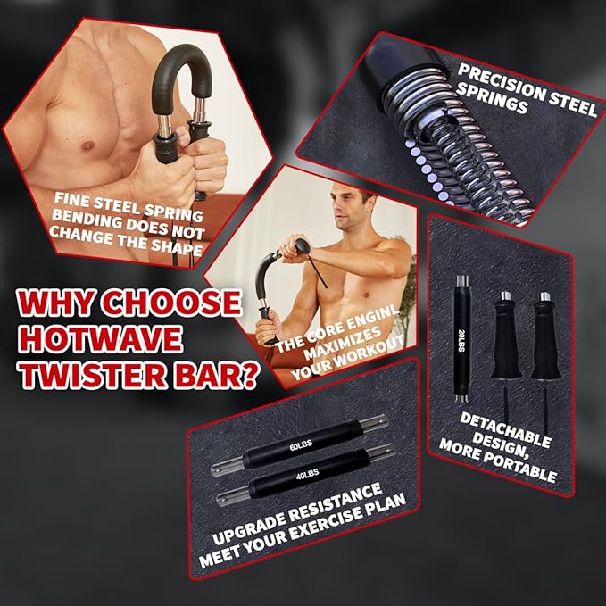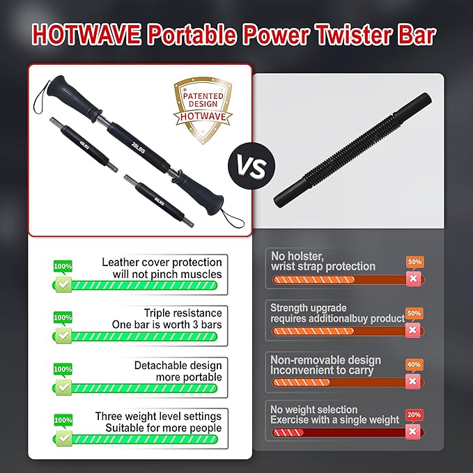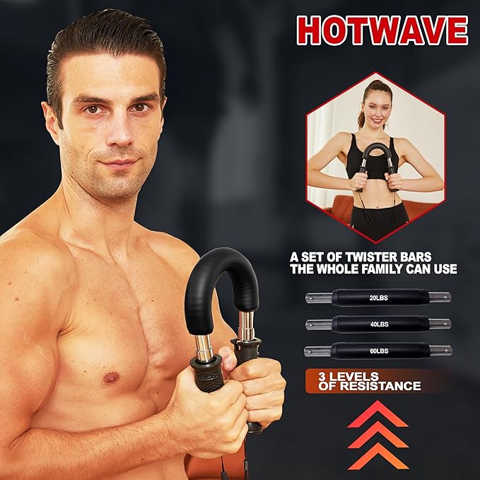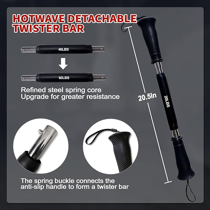 - 【Safe and stable】 Compared with ordinary torque stick, HOTWAVE Power Twister bar adopts high-grade leather wrap spring, Avoid injuries caused by the spring catching your body or hair during exercise.It adopts multi-layer spring structure, quenching and electroplating process to make it more flexible and durable, without deformation.Easy to install and disassemble.