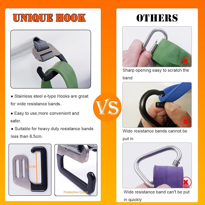 - Unique e-type hook with rubber coating: Our resistance band bar features a stainless steel large size e hook with a unique shape, designed specifically for wide resistance bands. The rubber coating provides extra protection, preventing the resistance band from getting cut by the metal hook. It ensures a secure and easy hanging and removal of the bands.