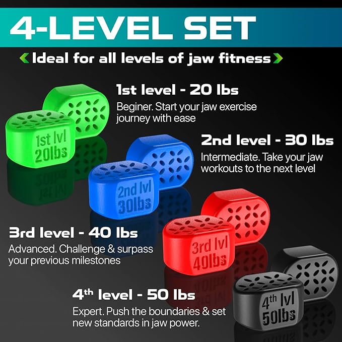 - 4-Pack Set: Includes 8 pcs & 4 resistance levels (Green: 20 lbs; Blue: 30 lbs; Red: 40 lbs), allowing you to customize your workout and gradually increase the intensity as your jaw muscles grow stronger. Exercise & progress at your own pace!