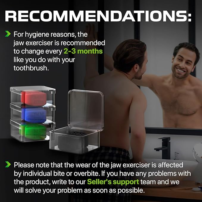 - Hygiene: For hygiene reasons, the jaw exerciser is recommended to change every 2-3 months like you do with your toothbrush. Please note that the wear of the jaw exerciser is affected by individual bite or overbite. If you have any problems with the product, write to our Seller's support team and we will solve your problem as soon as possible. Tmj relief products jaw. Fitness for your face!