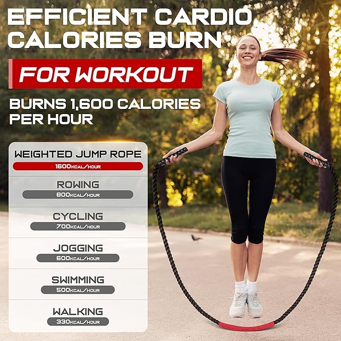 - ”Perfect Choice for Fitness, Healthy“: It's no secret that skipping rope is a great way to get fit. Using a heavy jump rope helps to exercise the whole body more effectively. Triple-weighted, multi-fold fat burning! Each energizing leap ignites calorie burning, boosts stamina, and promotes weight loss. Enhance everyday life quality; in order to better yourself, please use weighted jump ropes to jump now