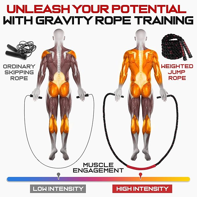 - ”Better Results, Less Time“: It is scientifically proven that 10 minutes of intense jumping with a weighted jump rope is equivalent to 30 minutes of running. This heavy-duty rope is 10 times more efficient at working your core muscles than a standard jump rope. It adds an extra challenge to your cardio routine, helping you build strength and endurance with every jump. Elevate your workouts and achieve your fitness goals faster