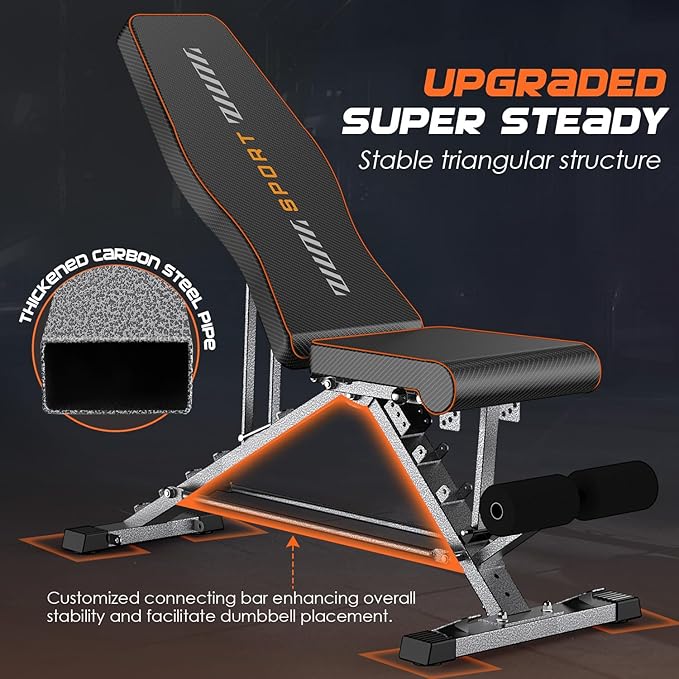 - Super Stable Triangular Structure: The upgraded work out bench design features a more robust triangular structure with a connecting bar in the middle, not only enhancing overall stability but also serving as a practical space-saving area for placing dumbbells.