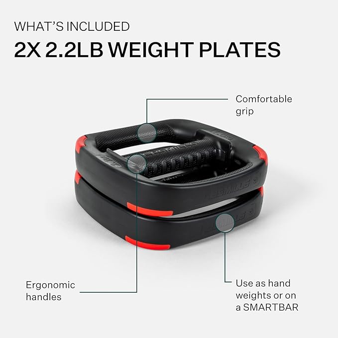 - Squared weight plates lock securely into the SMARTBAR barbell’s ‘gator‘ teeth and mean the SMARTBAR won’t roll away. The SMARTBAR is available for purchase separately.