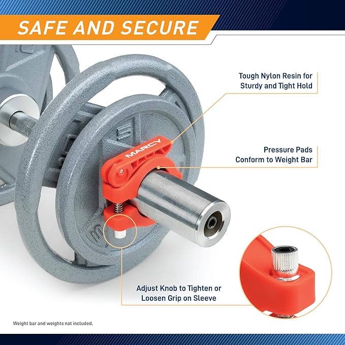 - Fits Olympic Bars: The Marcy Olympic Lock Collar Clips are made to fit Olympic bars. Use the tension control knob to add a bit more pressure as needed for a safe workout. And, the pressure pads ensure the bar is gripped tight, while also conforming to the Olympic Bar.
