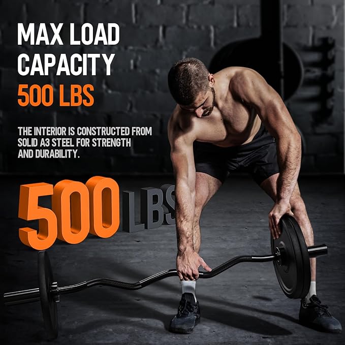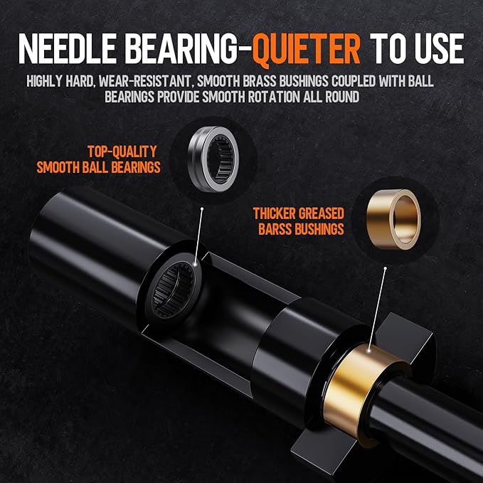 - SUPERIOR BEARINGS & BRASS BUSHINGS - This Olympic curl bar is 47inch long, compatible with all 2" Olympic plates. Its 2 ball bearings and 2 brass bushings makes it can withstand up to 500lbs of weight. There's no need to worry about it being as fragile as other cheap Olympic Curl Bar.
