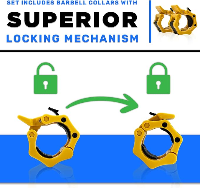 - ✅ INCLUDES BARBELL COLLARS so you can prevent plates from slipping off.