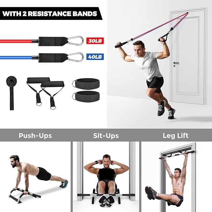 - MULTIFUNCTION - ONETWOFIT door frame pull up bar comes with extra resistance bands set which includes 2*resistance bands(1 for 30lb &1 for 40lb),2*handles, 2*legs ankle straps, and 1* door Anchor. Simple exercise tools help to build muscles and improve posture and balance.