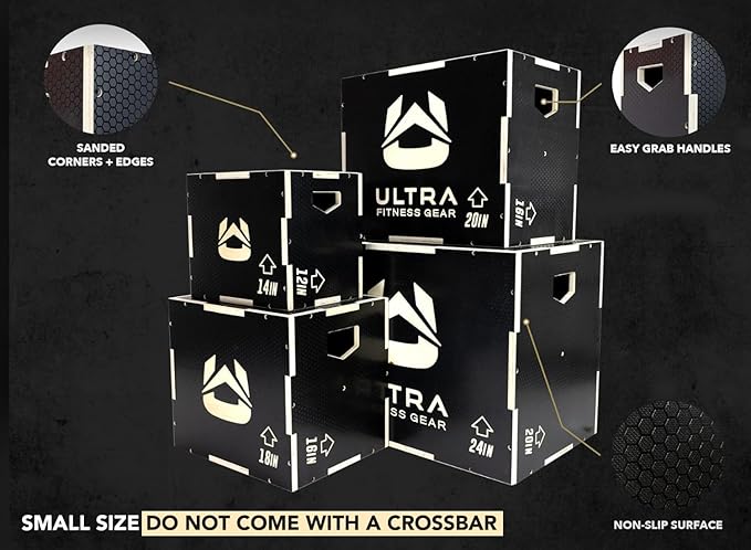 - Built for Plyometrics. Ultra Fitness Gear plyo box features 3 different height options for training flexibility: 16/14/12. Develop strength with our plyometric box at home or the garage gym through squat, step up, dip, box jump training & more. SMALL SIZE DO NOT COME WITH A CROSSBAR.