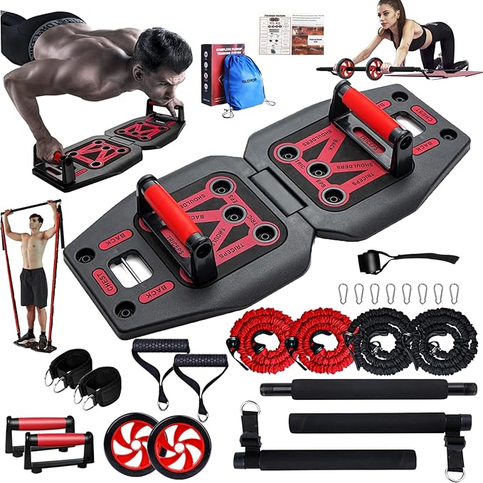 - Portable Home Gym System Set includes: 2x30LB red resistance rope, 2x50LB black resistance bands, push up board, detachable three section pilates bar,2 AB rollers 2 rubber handles, 2 thickened ankle straps, 2 knurled handle straps, door anchor straps, thickened mountain buckle, anti slip tape, training guide, storage bag, and thickened color box packaging. workout equipment home gym sets for men and women. As a healthy gift for those you care about