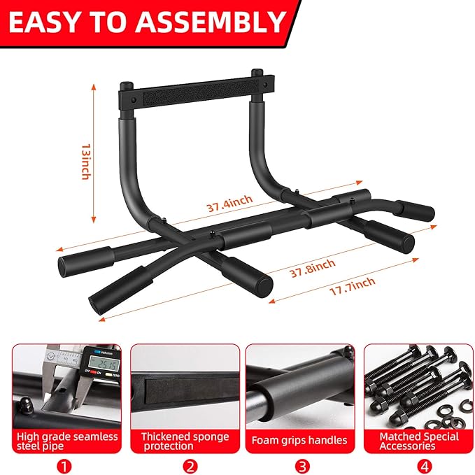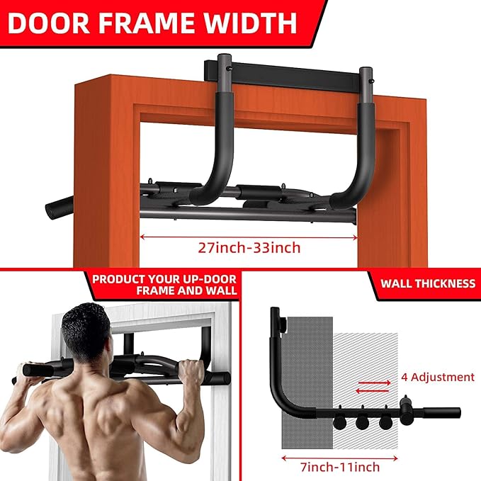 - Protection for Door - The improved chin-up bar has high density sponge cushion to protect door frame and wall from damage. The ingenious design makes the bearing focus on the wall rather than the door frame. So make sure the wall where you install the pull up bar is solid. What’s more, each grip is covered with thickened comfortable foam, which is anti-slip and anti-odor.