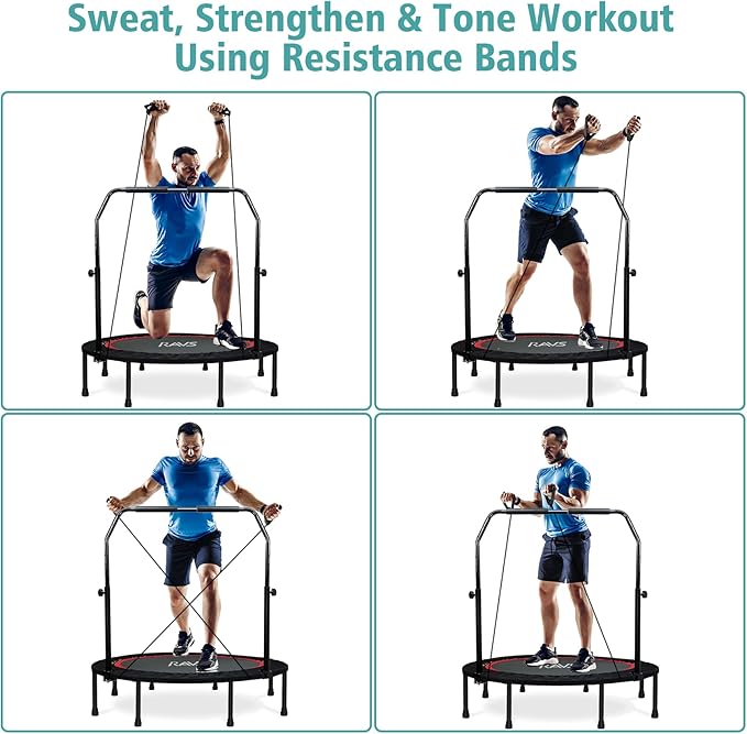 - 5-Levels Height Adjustable Handrail: Compared with conventional trampoline, RAVS workout trampoline have additional support handrail accessory which will keep balance for kids and adults during workout or exercise. 5 levels handrail height can be adjusted from 38 to 46 inches according to your requirement.