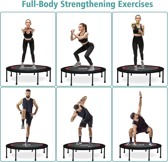 - Sturdy & Safe Mini Trampoline For Kids Adults : With premium quality of anti-slip PP jumping mat, 32 pcs of high strength stainless steel springs and heavy-duty steel frame, RAVS exercise trampoline can support body weight as much as 350lbs, which will keep safety for kids and adults.