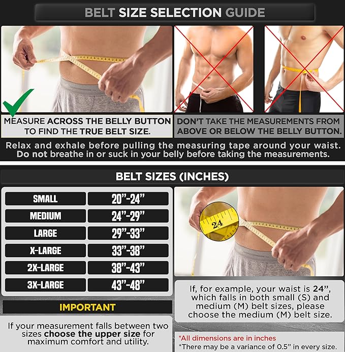 • DO NOT TRUST YOUR PANT SIZE – S (20”-24”), M (24”-29”), L (29”-33”), XL (33”-38”), 2XL (38”-43”), 3XL (43”-48”). Please ensure that you measure your size ACCORDING TO THE SIZE CHART AND THE MEASURING INSTRUCTIONS provided in the size chart. Measure around your lower back and across your belly button to find your TRUE BELT SIZE. Measurements taken at pant size would result in WRONG BELT SIZE. If your waist size falls between two sizes, please CHOOSE THE UPPER SIZE for maximum utility.